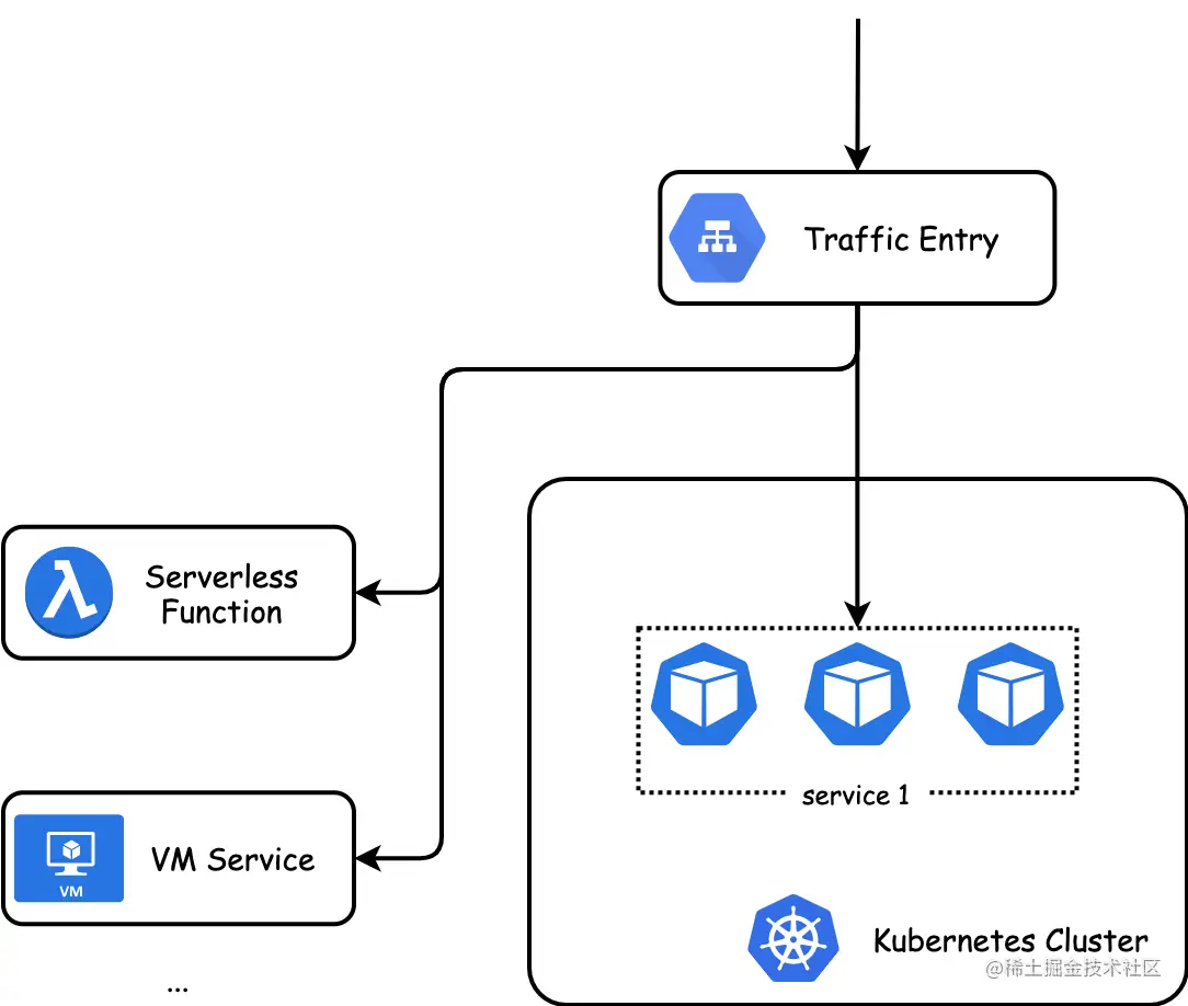 除了多集群,用户在云原生改造的过程中,常常会面临部分服务已经做了容器化改造,运行在 Kubernetes 集群,部分不便改造的服务仍在虚拟机的情况,甚至会有部分使用的是云厂商 serverless 云函数服务(e.g. AWS lambda)。接入层需具备异构服务注册/发现的能力,以管理异构部署服务的南北向流量。