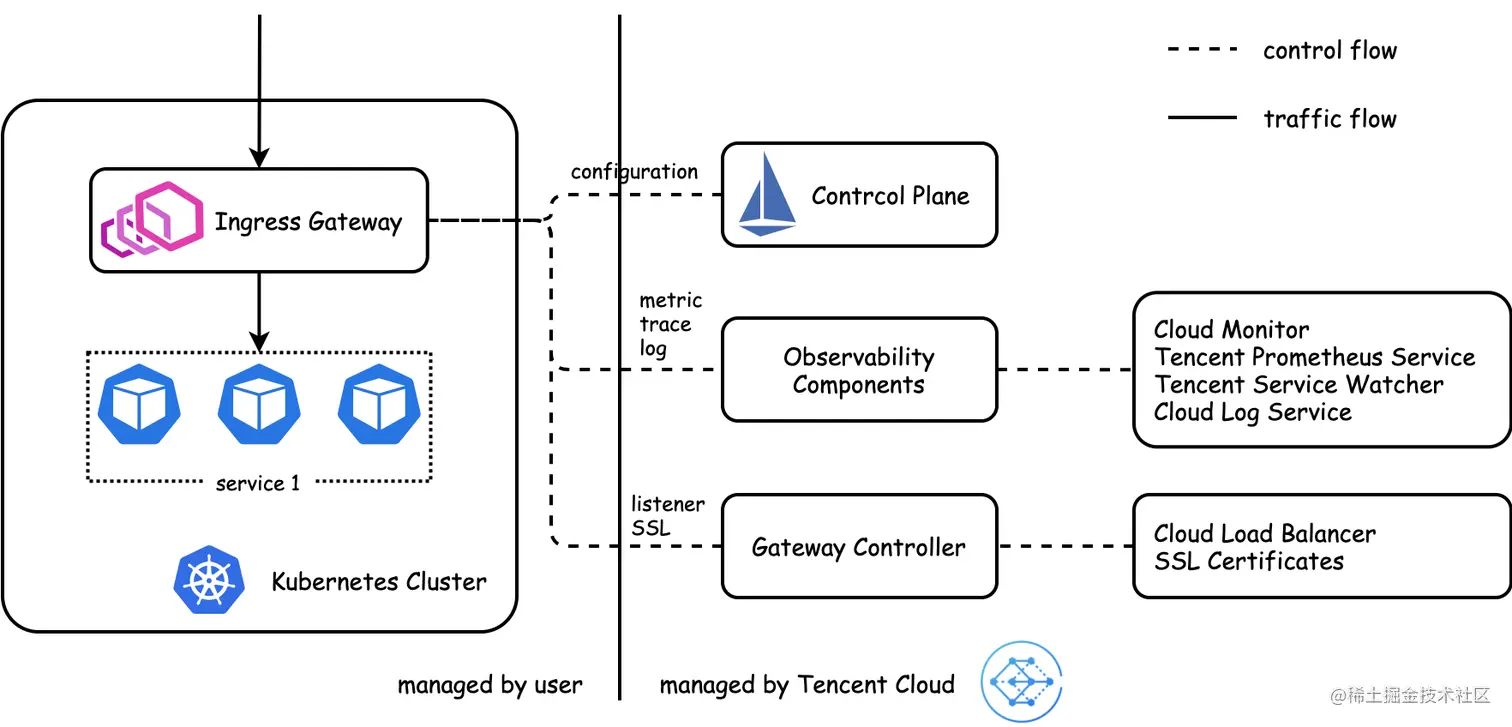 腾讯云服务网格 TCM,是腾讯云完全兼容 Istio 的 Service Mesh 产品,目前已实现了控制面组件托管,使用 TCM Ingress Gateway 只需要部署一组数据面 envoy pod 在业务集群,即可开箱即用上述 Istio Ingress Gateway 的所有入口流量管理能力。同时,TCM 集成了腾讯云监控、证书周边产品,提供开箱即用的可观测能力和证书配置功能。