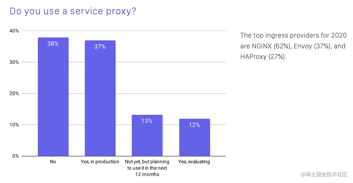 Kubernetes Ingress 小结:对于简单的 HTTP 流量的路由,使用 Ingress 配置非常容易,这也是当前 Ingress 受欢迎的原因(据 CNCF 2020 云原生调查报告 [2],50% 的用户正在或即将使用第三方代理做应用流量转发,其中 Nginx 和 Envoy [3] 是最受欢迎的 Ingress provider)。