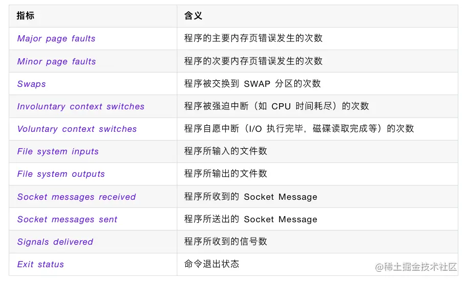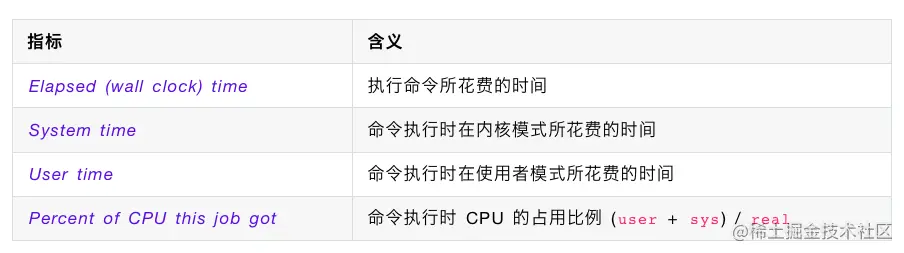不过,time 命令输出了三个参数,我们只用到了第一个参数,其它两个参数代表什么含义呢?