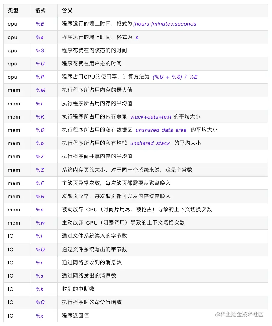 如果命令中内置的输出格式,不符合你的需求,GNU time 可以支持自定义输出格式,通过选项 -f 可以各种指标参数