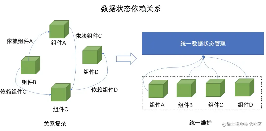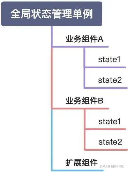 Redux这样的数据状态管理库已经能够在同一个组件的不同子组件之间跨级共享数据状态,但是两个业务组件之间共享数据状态则需要在这两个业务组件之间加一个公共父组件,再通过Redux这样的数据管理方案进行数据状态的共享,但是想要从业务组件A访问当业务组件B中的数据状态就非常的难。