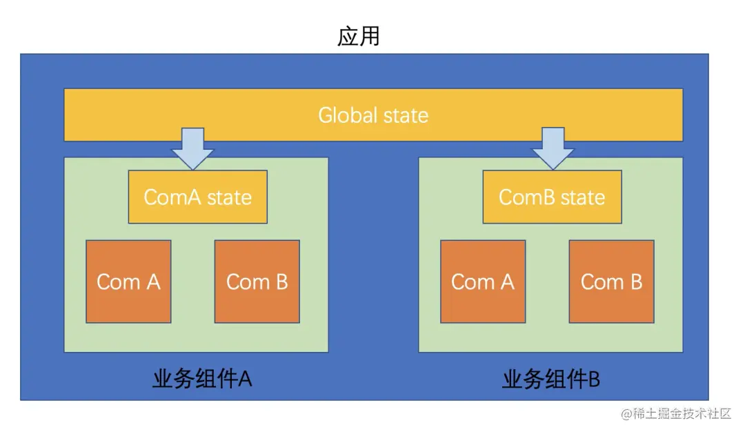 如果业务组件A和业务组件B的数据状态能够分别维护在组件内部,但是又可以通过某种方式相互访问那就最好不过了。
