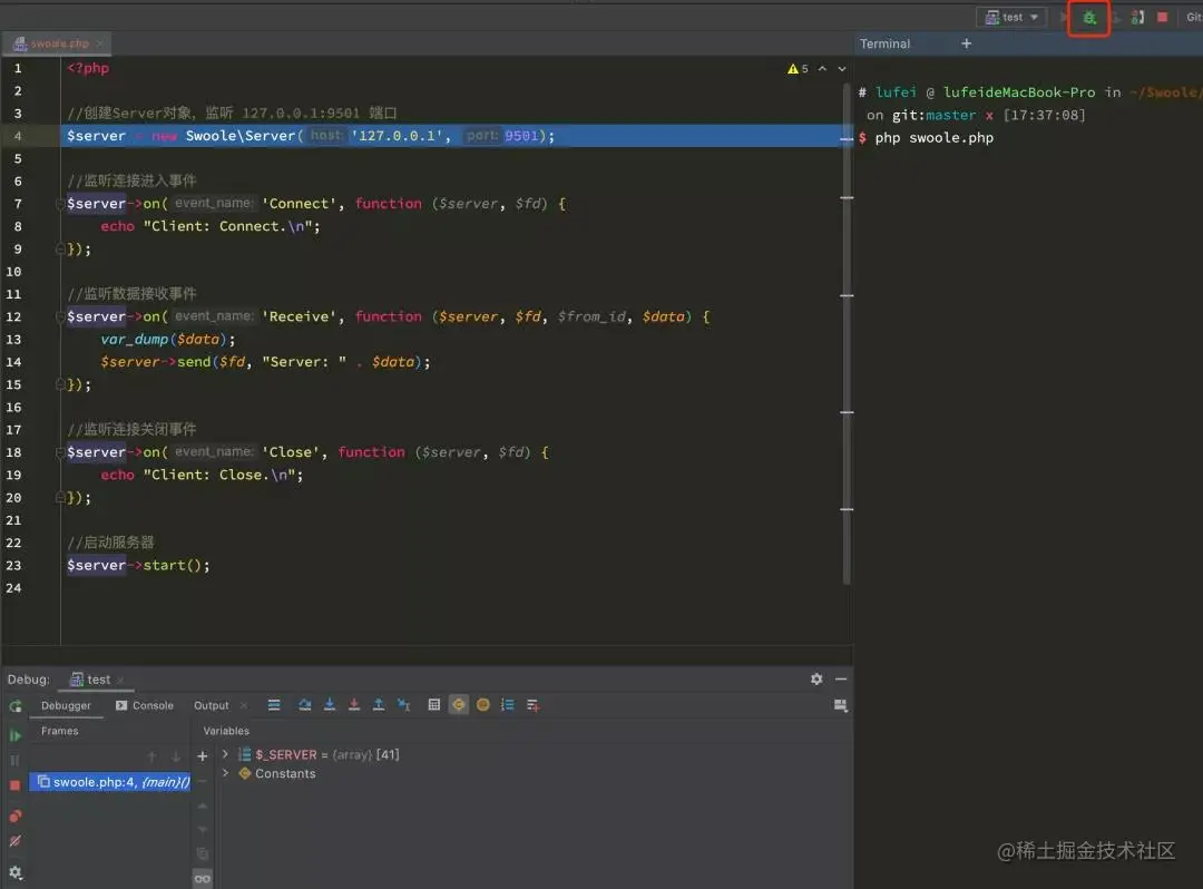 点击右上角的绿色虫子进入 Debug 状态,启动我们的服务,会发现自动断在了第 4 行创建 Server 对象的地方