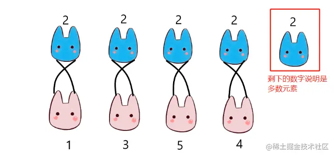 假设不同数字相互抵消,那么最后剩下的数字,就是我们要找的多数元素。