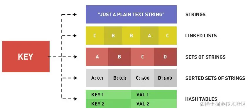 Redis 有望所有的key(键)都是字符串。我们在谈基础数据结构时,讨论的是存储值的数据类型,主要包括常见的5种数据类型,分别是:String、List、Set、Zset、Hash