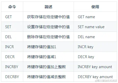 127.0.0.1:6379> set hello world OK 127.0.0.1:6379> get hello "world" 127.0.0.1:6379> del hello (integer) 1 127.0.0.1:6379> get hello (nil) 127.0.0.1:6379> get counter "2" 127.0.0.1:6379> incr counter (integer) 3 127.0.0.1:6379> get counter "3" 127.0.0.1:6379> incrby counter 100 (integer) 103 127.0.0.1:6379> get counter "103" 127.0.0.1:6379> decr counter (integer) 102 127.0.0.1:6379> get counter "102"