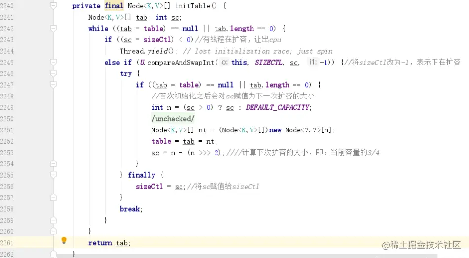 知道了这个变量的含义,上面的方法就好理解了,第二个分支采用了 CAS 操作,因为 SIZECTL 默认为 0,所以这里如果可以替换成功,则当前线程可以执行初始化操作,CAS 失败,说明其他线程抢先一步把 sizeCtl 改为了 -1。扩容成功之后会把下一次扩容的阈值赋值给 sc,即 sizeClt。