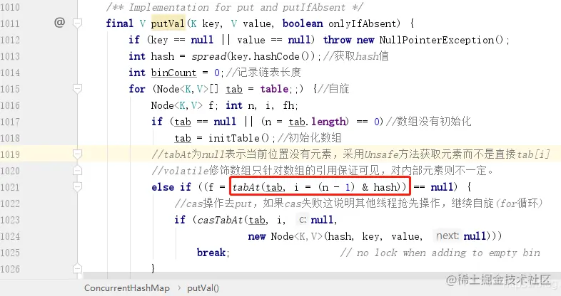 ConcurrentHashMap 中存储数据采用的 Node 数组是采用了 volatile 来修饰的,但是这只能保证数组的引用在不同线程之间是可用的,并不能保证数组内部的元素在各个线程之间也是可见的,所以这里我们判定某一个下标是否有元素,并不能直接通过下标来访问,那么应该如何访问呢?源码给你答案: