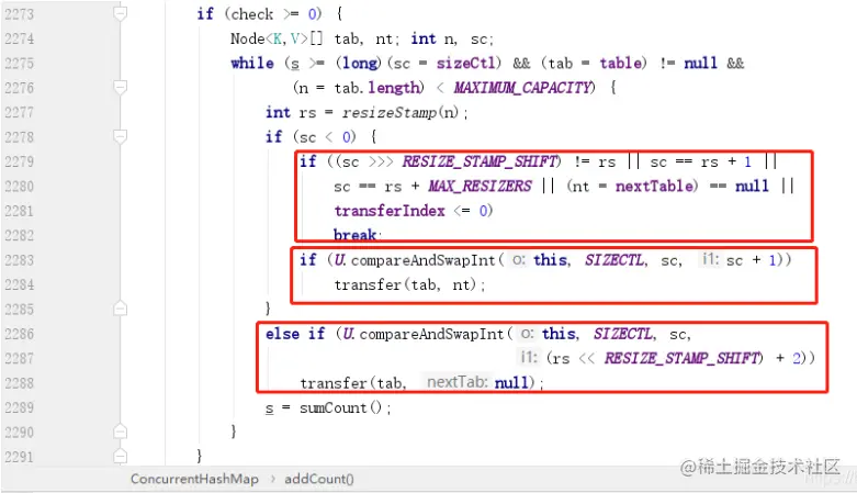 接下来我们需要回到 addCount 方法,因为这个方法在添加元素数量的同时,也会判断当前 ConcurrentHashMap 的大小是否达到了扩容的阈值,如果达到,需要扩容。