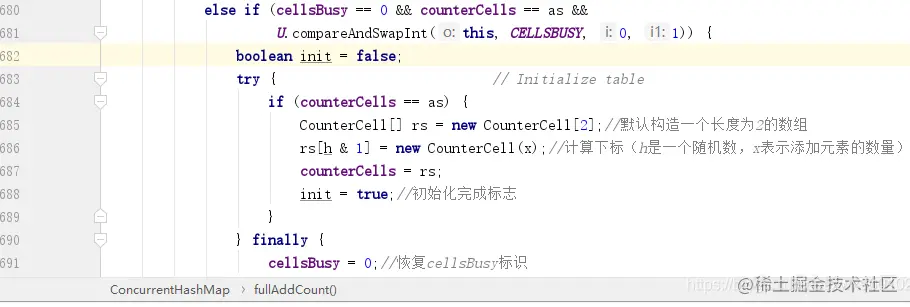 假如 CounterCell 为空且 CAS 失败,那么就会通过调用 fullAddCount 方法来对 CounterCell 数组进行初始化。