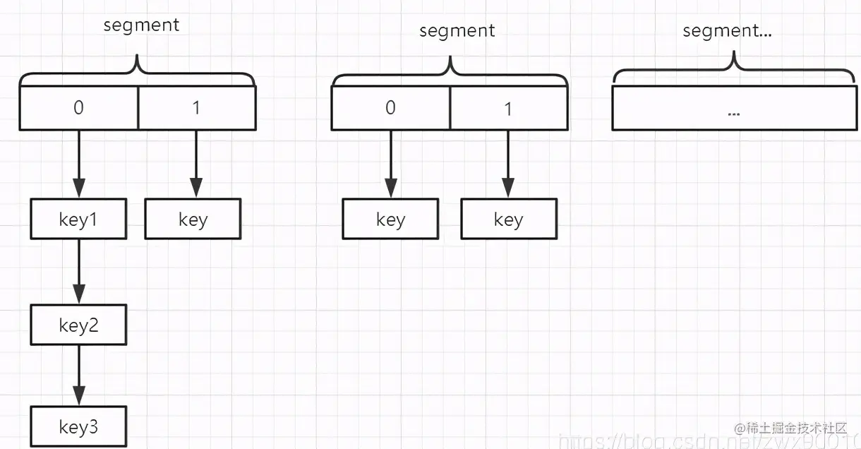 - 通过 hash 值和 段数组长度-1 进行位运算确认当前 key 属于哪个段,即确认其在 segments 数组的位置。