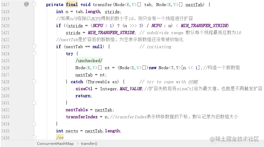 - transferIndex <= 0 表示当前可供扩容的下标已经全部分配完毕,也代表了当前线程扩容结束