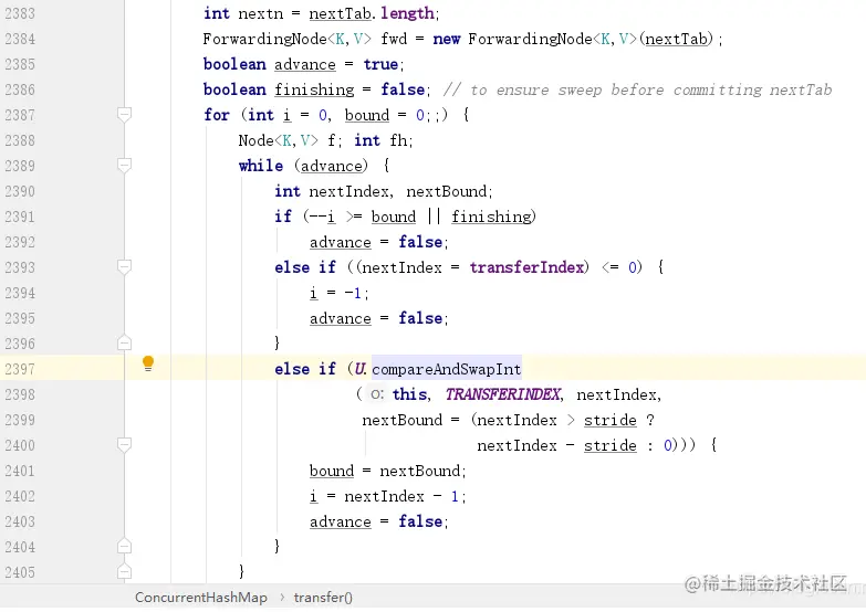 PS:因为 nextBound=0,所以 CAS 操作实际上也是把 transferIndex 变成了 0,表示当前扩容的数组下标已经全部分配完毕,这也是前面不满足扩容的第 5 个条件。