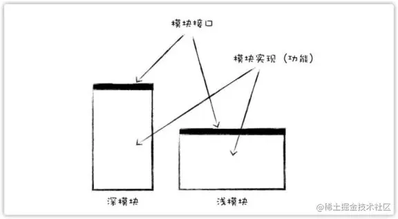 一个模块由接口(interface)和实现(implementation)两部分组成,如果把一个模块比喻成一个矩形,那么接口就是矩形顶部的边,而实现就是矩形的面积(也可以把实现看成是模块提供的功能)。当一个模块提供的功能一定时,深模块(Deep module)的特点就是矩形顶部的边比较短,整体形状高瘦,也即接口比较简单;浅模块(Shallow module)的特点就是矩形顶部的边比较长,整体形状矮胖,也即接口比较复杂。