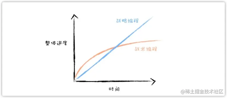 很多程序员在进行特性开发或 bug 修复时,关注点往往是如何简单快速让程序跑起来,这就是典型的_战术编程_(Tactical programming)方法,它追求的是短期的效益——节省开发时间。战术编程最普遍的体现就是在编码之前没有进行模块设计,想到哪里就写到哪里。战术编程在系统前期可能会比较方便,一旦系统庞大起来、模块之间的耦合变重之后,添加或修改功能、修复 bug 都会变得寸步难行。随着系统变得越来越复杂,最后不得不对系统进行重构甚至重写。