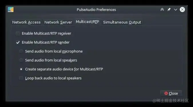 使用之前,首先,你必须确保安装了PulseAudio首选项(paprefs)包,以便你可以在你的PulseAudio配置中启用网络音频。在paprefs中,启用对本地声音设备的网络访问,可能不需要验证,并启用你的计算机昨晚播放/RTP发送者。