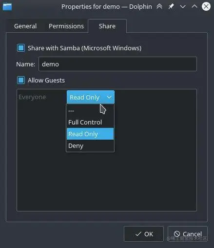 1、SambaSamba是种自由软件,用来让UNIX系列的操作系统与微软Windows操作系统的SMB/CIFS(Server Message Block/Common Internet File System)网络协定做连结。尽管大多都是低级代码,许多用户从来不会刻意使用它,但它的重要性不可低估。该项目可以确保Linux和Windows计算机轻松在同一网络运行,换句话说,Samba使通过本地网络共享文件变得很容易,而不管使用的是什么平台。在KDE Plasma桌面,你可以右键单击任何目录选项并选择Properties。在属性对话框中,单击共享标签,选择“与Samba共享(Microsoft Windows)”。