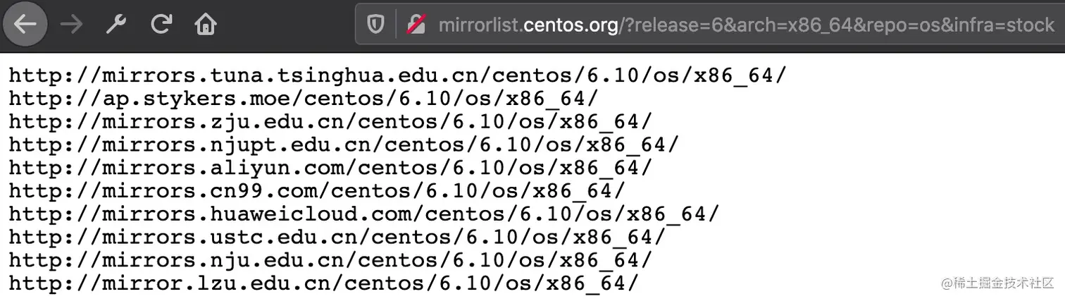 mirrorlist:镜像列表地址,打开之后是一个记录多个镜像地址的列表,会自动在这些列表中扫描选择镜像资源
