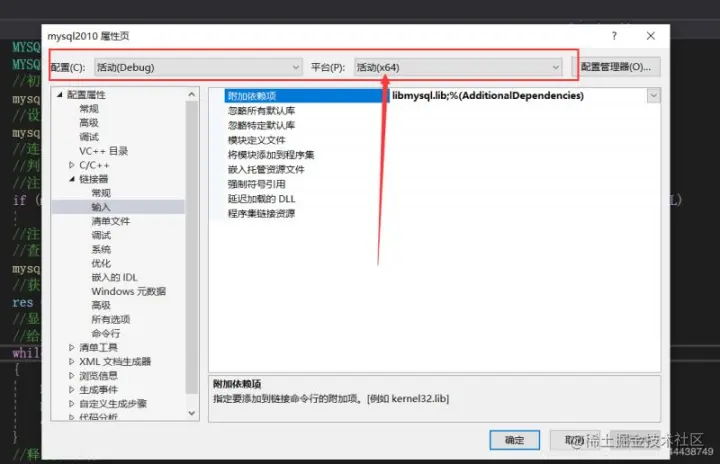 第八步:查看属性页上方的平台,选择x64,x32可能会出错。