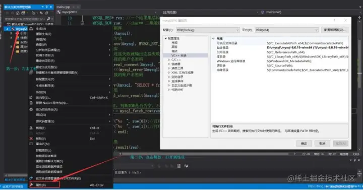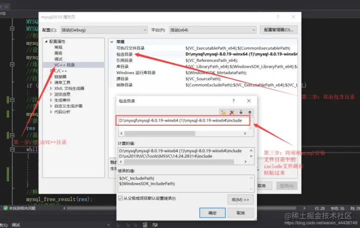 第四步:打开VC++目录,在包含目录中,将mysql安装文件中的include文件的路径添加到这里: