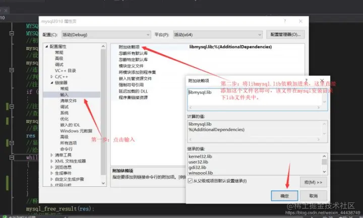 第七步:还是在属性页的链接器中,点击第二项输入,将libmysql.lib文件加进来,注意,这里直接把libmysql.lib这个依赖名加进去进行,不要加路径。这个文件也在mysql安装文件夹中lib目录下: