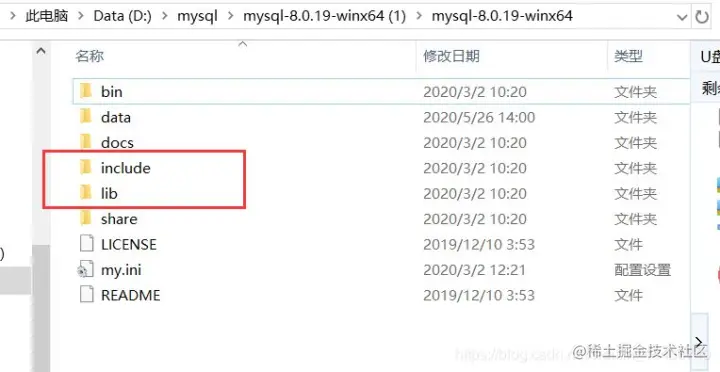 第一步:打开mysql的安装目录,我本地的安装目录如下:(注意是否有include和lib文件夹)