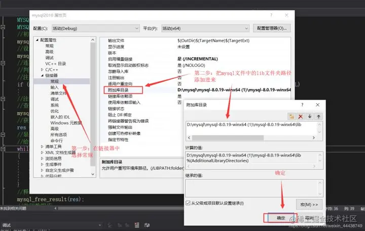 第六步:还是在属性页上,点开链接器选项,点击常规,将mysql安装文件夹中的lib文件路径添加到附加库目录中:
