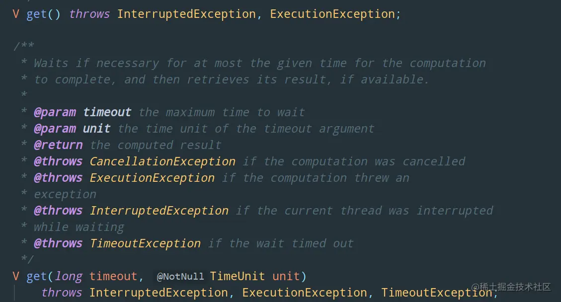 另外,FutureTask 还间接继承了 Future 接口,并且,这个 Future 接口定义了可以获取 call() 返回值的方法 get: