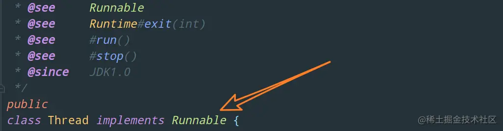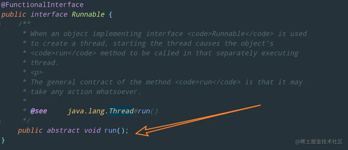 事实上,它并不是 Thread 类自己的。Thread 实现了 Runnable 接口,run 方法正是在这个接口中被定义为了抽象方法,而 Thread 实现了这个方法。