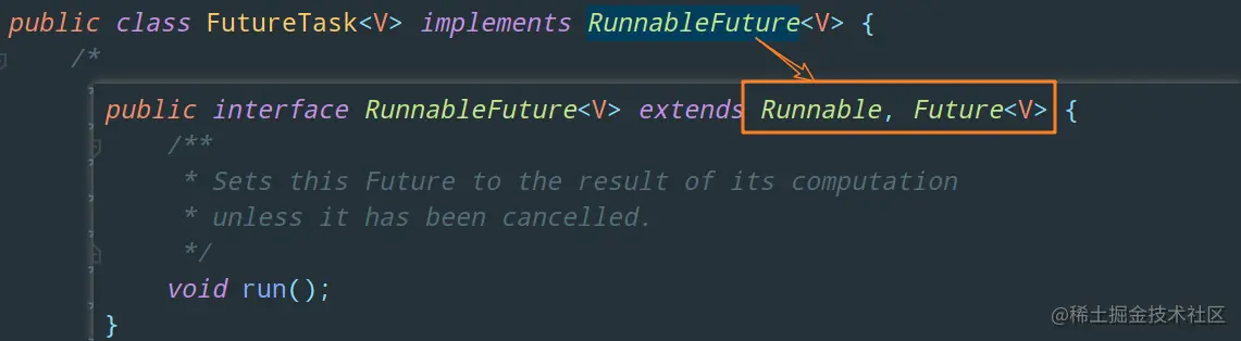 可以看到 FutureTask 间接继承了 Runnable 接口,因此它也可以看作是一个 Runnable 对象,可以作为参数传入 Thread 类的构造函数。