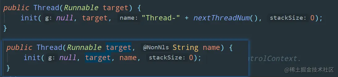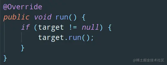 而这段 run 方法代码的意思就是说,如果 taget != null,也就是说如果 Thread 构造函数中传入了 Runnable 对象,那就执行这个 Runnable 对象的 run 方法。
