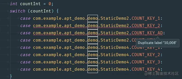 那么Android上怎么开发,Java可以利用switch...case...语法不能有重复字段申明的特性,把上诉问题转化为下面的代码