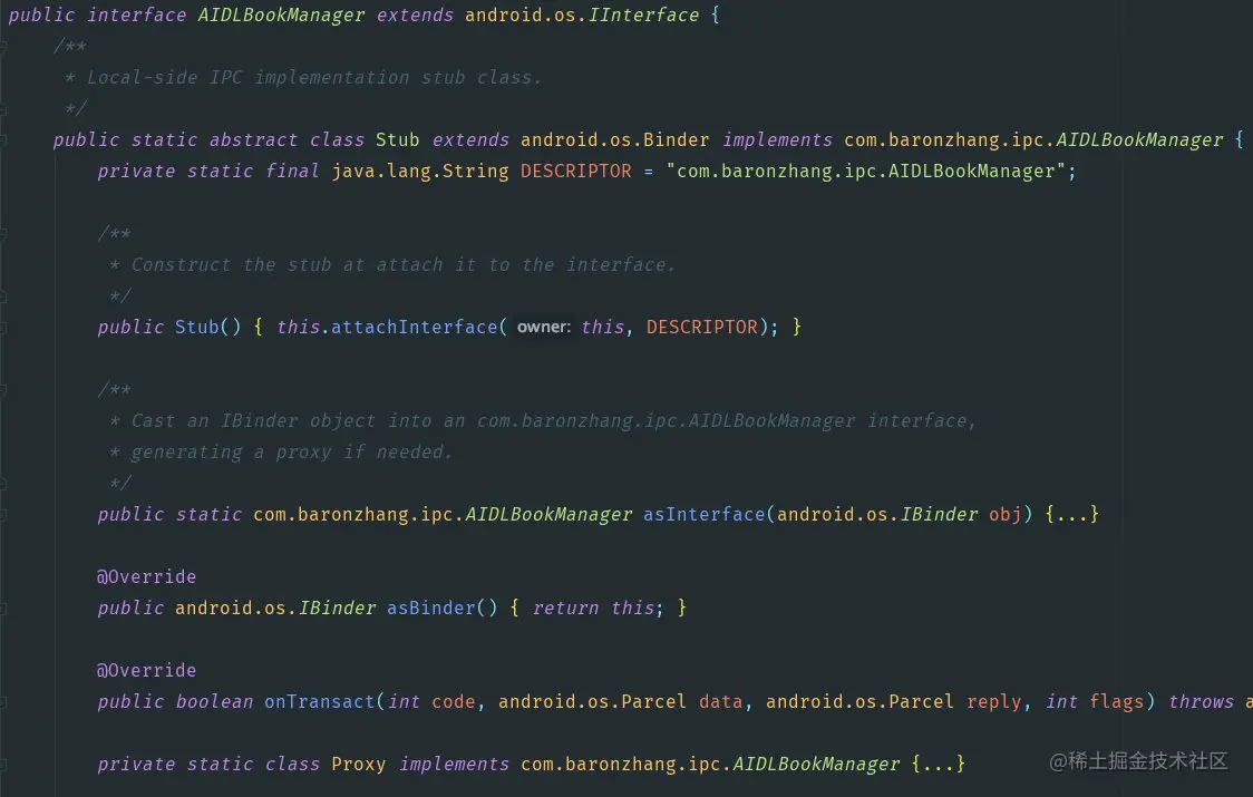 接着上面的问题,上面的asInterface方法是运行在调用进程的,因为在不同进程没有办法把需要的BookManager实例对象(即Stub)直接拿到,所以需要有一个代理对象(Proxy)帮助我们实现好像拿到了BookManager实例对象的感觉.