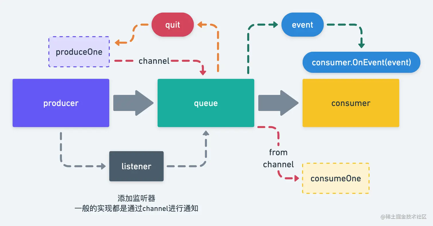 Produce():由开发者编写生产消息的逻辑AddListener():添加事件listener