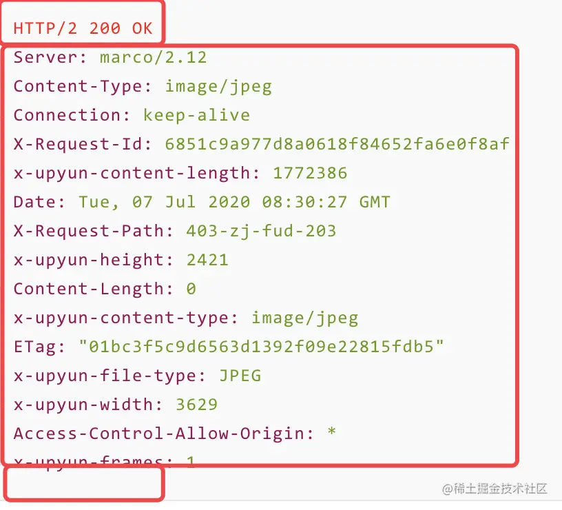 以又拍云存储接口文件上传完毕后返回的响应报头为例,第一行“HTTP/2 200 OK”为状态行,由三部分构成: