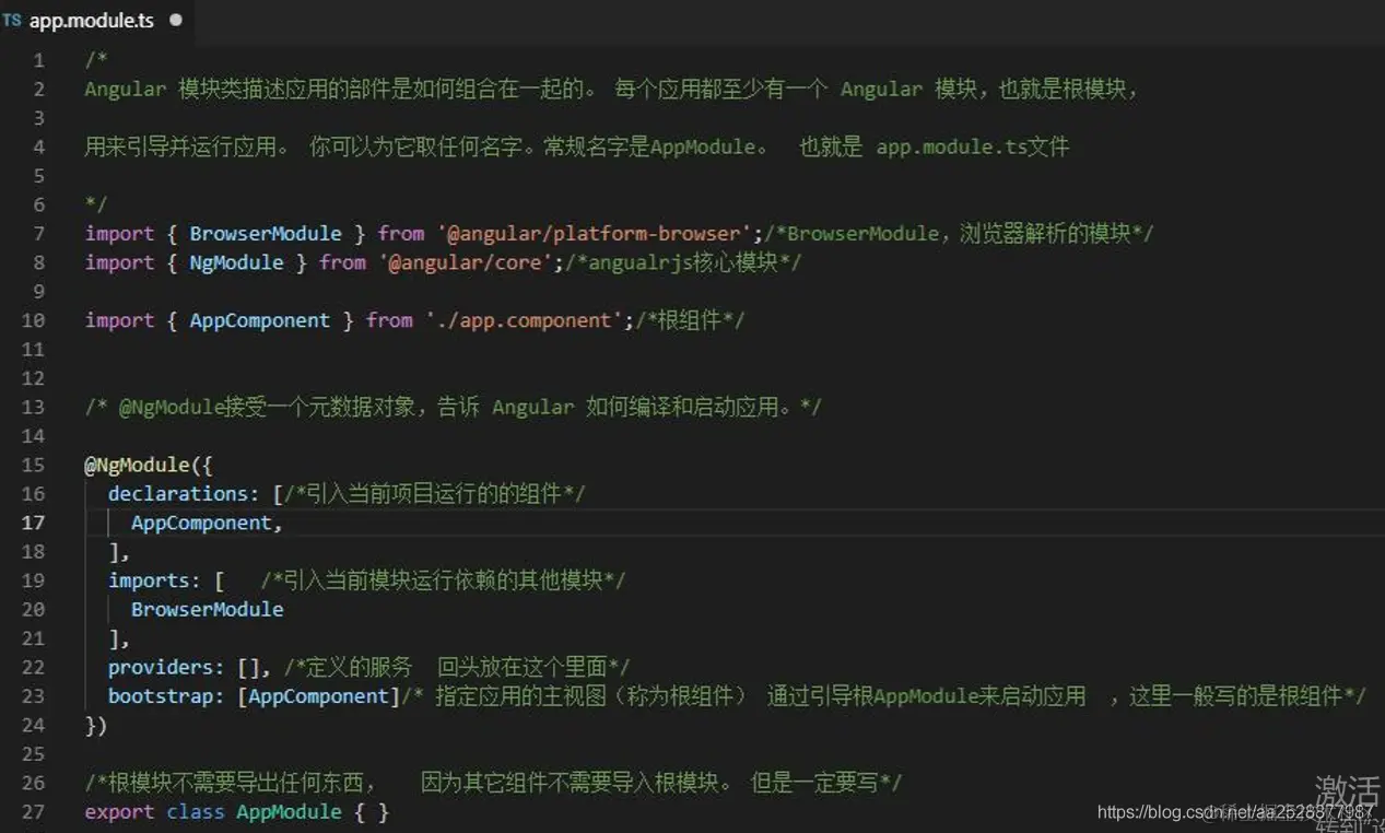 定义 AppModule,这个根模块会告诉 Angular 如何组装该应用。 目前,它只声明了 AppComponent。 稍后它还会声明更多组件。