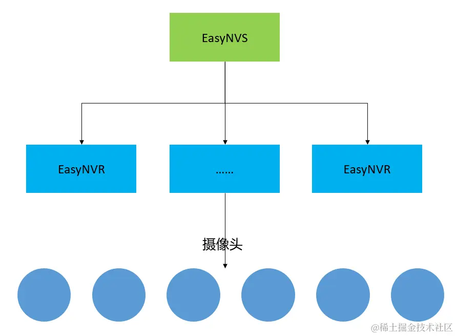 目前我们可以实施的部署方案架构大致如下,即EasyNVR接入一定数量的前端设备,分布多个EasyNVR,再有一套EasyNVS统一管理EasyNVR: