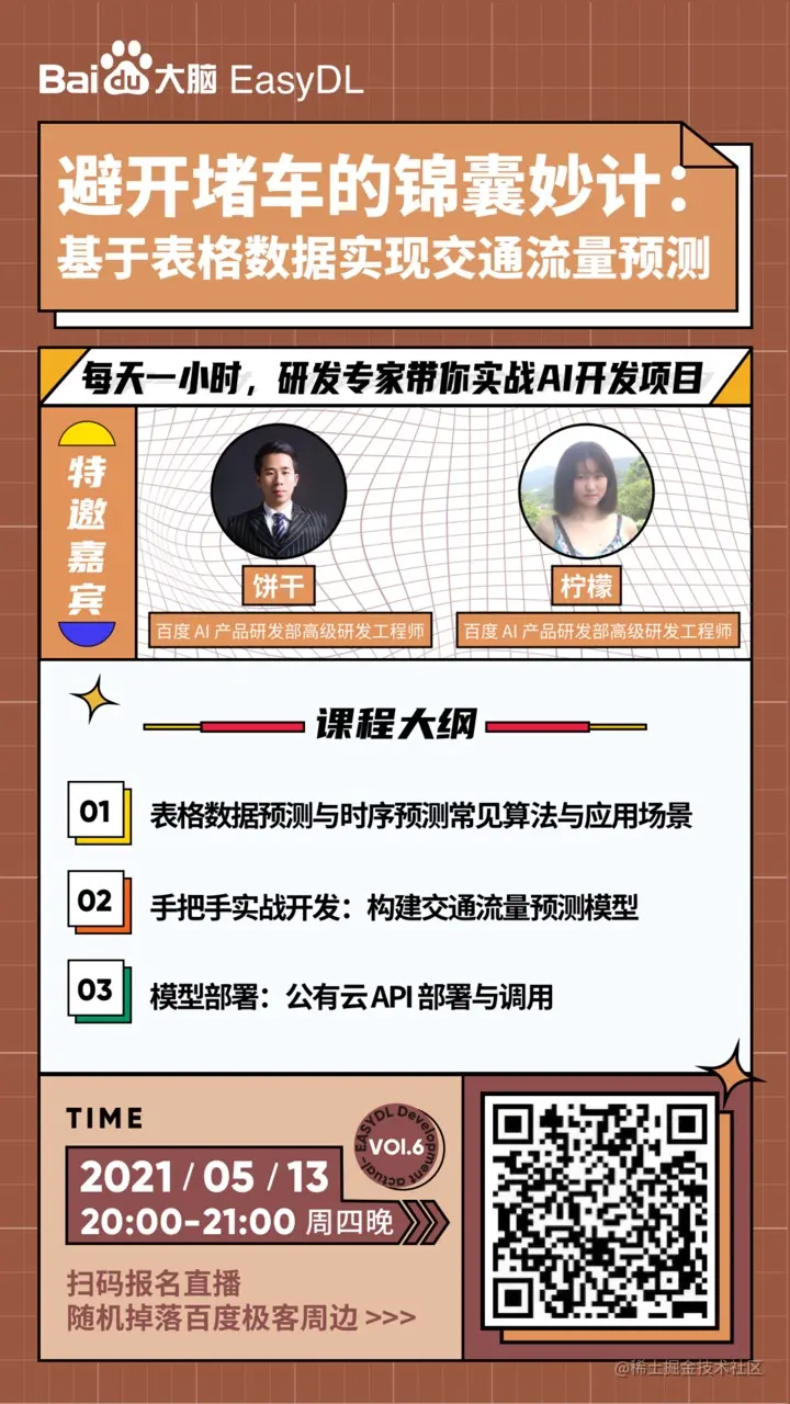 今晚,EasyDL零门槛AI开发实训营迎来收官一课:【结构化数据建模与交通流量预测实战】,详细讲解表格预测与时序预测两大重点模型,从业务应用深入到技术解析,配合模型交通流量预测模型开发实战,一小时实现机器学习模型从零到一突破!