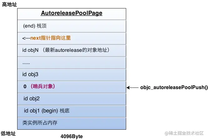 每当进行一次objc_autoreleasePoolPush调用时,runtime向当前的AutoreleasePoolPage中add进一个哨兵对象,值为0(也就是个nil),那么这一个page就变成了下面的样子: