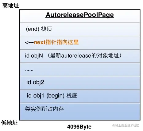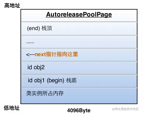 上面的id *next指针作为游标指向栈顶最新add进来的autorelease对象的下一个位置。 一个AutoreleasePoolPage的空间被占满时,会新建一个AutoreleasePoolPage对象,连接链表,后来的autorelease对象在新的page加入。