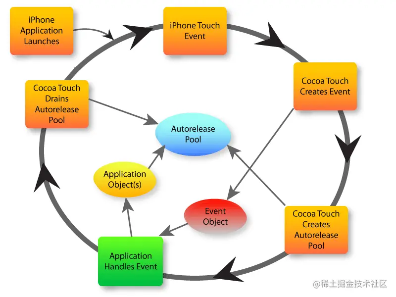 当向一个对象发送一个autorelease消息时,Cocoa就会将该对象的一个引用放入到最新的自动释放池。它仍然是个正当的对象,因此自动释放池定义的作用域内的其它对象可以向它发送消息。当自动释放池释放时,其中所有被管理对象都会收到”release”的消息, 从而池中的所有对象也就被释放。注意,同一个对象可以被多次调用”autorelease”方法,并可以放到同一个”AutoreleasePool”中。 所以引入这个自动释放池机制,对象的”autorelease”方法代替”relrease”方法可以延长它的生命周期,直接到当前”AutorelreasePool”释放。