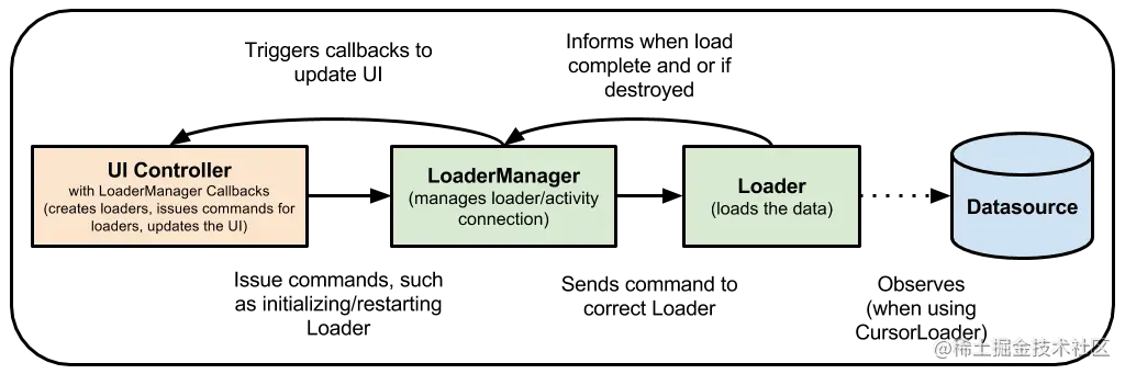 在使用加载器的一种常见方法中,应用可能会使用 CursorLoader 观察数据库的内容。当数据库中的值发生更改时,加载器会自动触发数据的重新加载并更新界面: