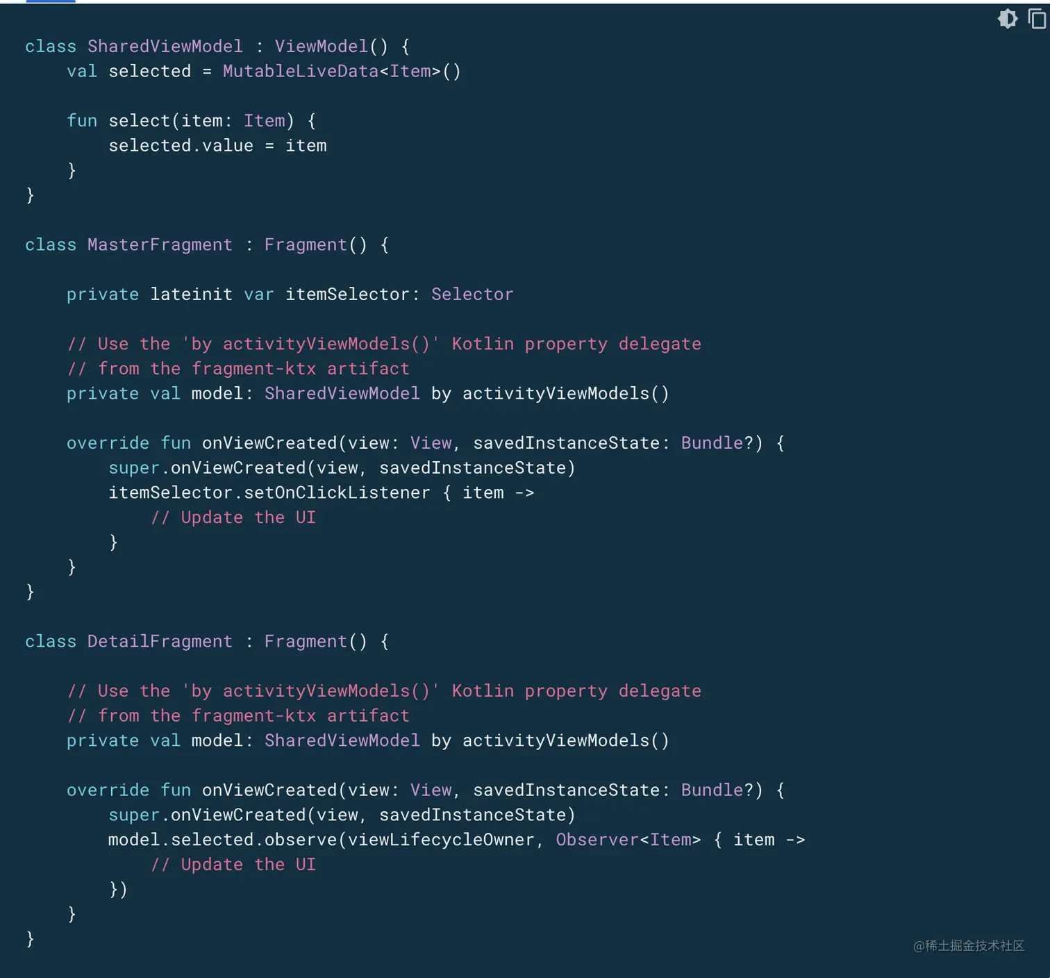 请注意,这两个 Fragment 都会检索包含它们的 Activity。这样,当这两个 Fragment 各自获取 ViewModelProvider 时,它们会收到相同的 SharedViewModel 实例(其范围限定为该 Activity)。