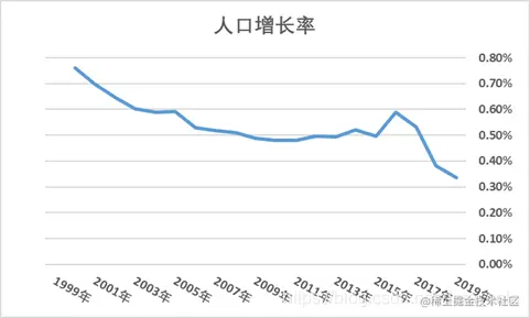 近20年来(2000~2019)年末总人口统计局网站上都是有的,就拿出来算了算增长率,可以看到人口增长率是在持续下跌的,和普查的趋势一样,19年较18年增长0.33%,峰值是2016年的0.59%,这一年全面二孩政策放开,给人口带来了一波利好。