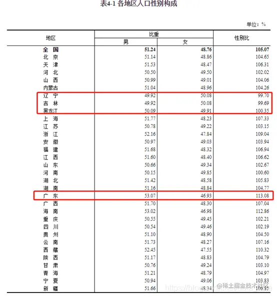 各地区人口性别比比较有趣的是广东性别比居然是最大的,达到了113(女100,男113),而东三省的性别比最低,辽宁和吉林甚至女多男少。
