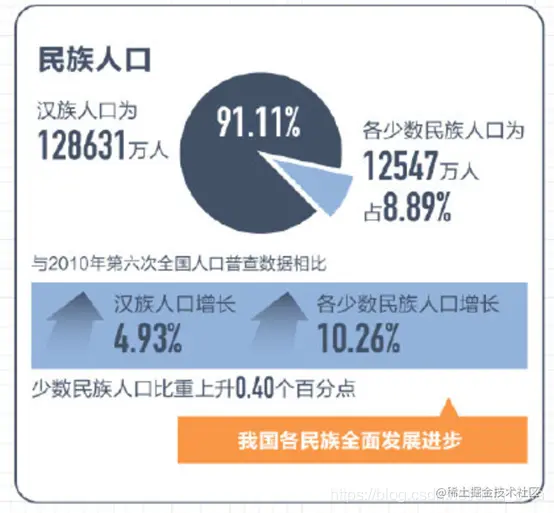汉族人口为128631万人,占91.11%;各少数民族人口为12547万人,占8.89%。与2010年相比,汉族人口增长4.93%,各少数民族人口增长10.26%,少数民族人口比重上升0.40个百分点。民族人口稳步增长,充分体现了在中国共产党领导下,我国各民族全面发展进步的面貌。