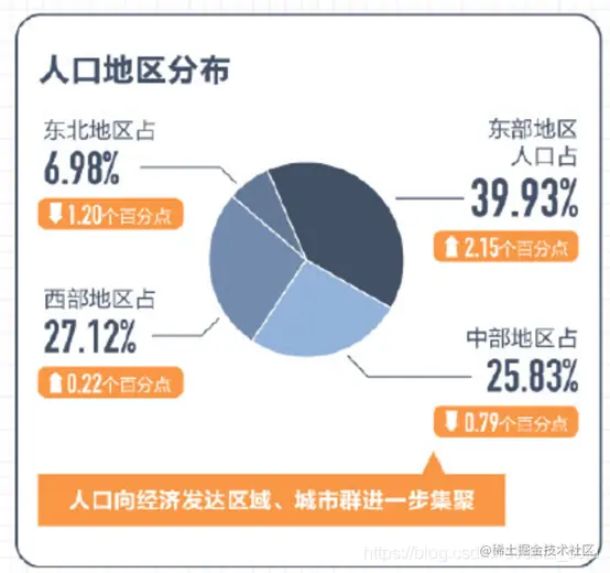 东部地区人口占39.93%,中部地区占25.83%,西部地区占27.12%,东北地区占6.98%。与2010年相比,东部地区人口所占比重上升2.15个百分点,中部地区下降0.79个百分点,西部地区上升0.22个百分点,东北地区下降1.20个百分点。人口向经济发达区域、城市群进一步集聚。