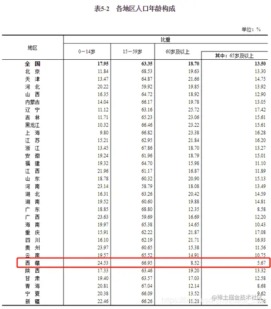 分地区看人口年龄构成,除西藏外,65岁及以上老年人口比重均超过7%,也就是除西藏以外,都是老龄化省份,其中,12个省份65岁及以上老年人口比重超过14%,严重老龄化。