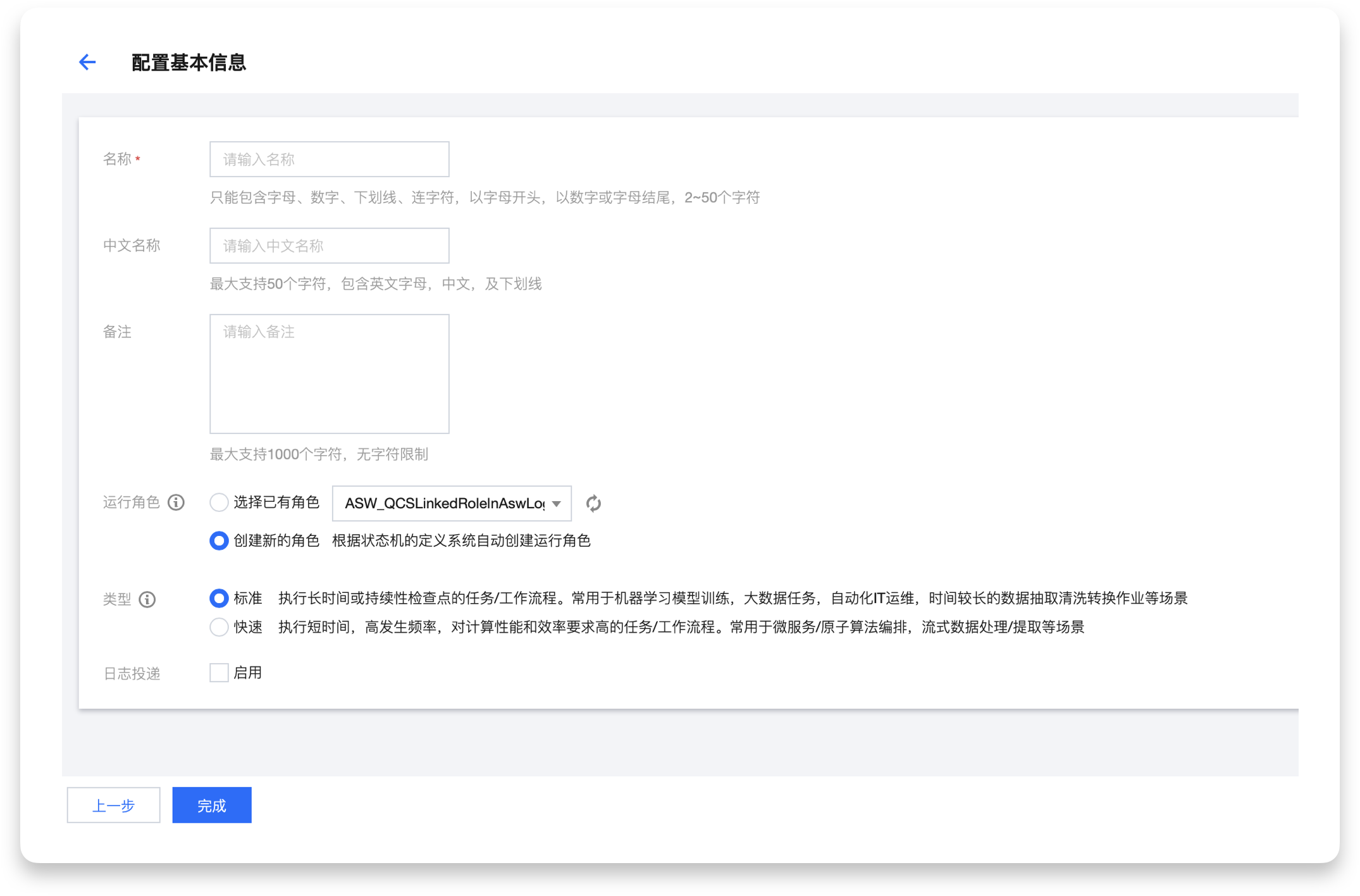 - 单击「下一步」,在「配置基本信息」页面,输入工作流名称,选择运行角色与工作流类型,单击「完成」,完成工作流创建。